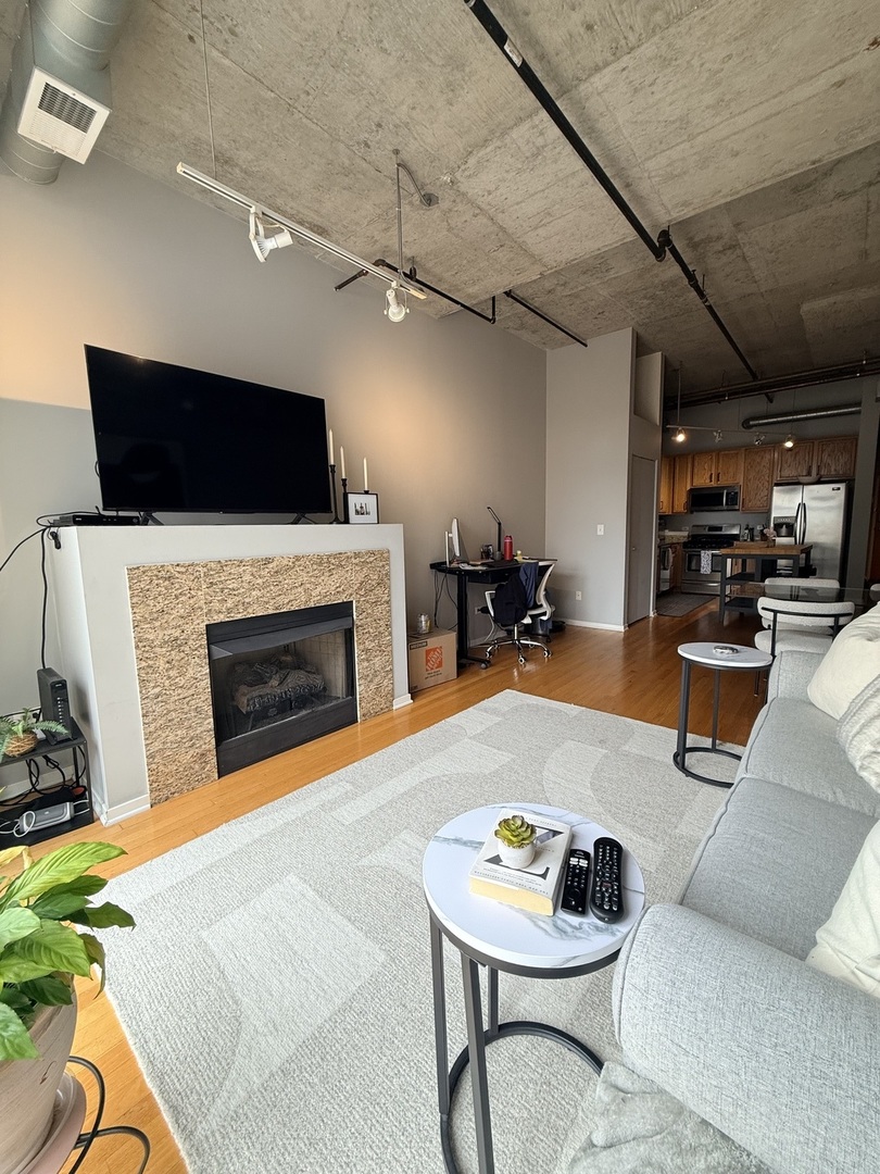 Welcome home to this sun-drenched, high-floor 1-bedroom in one of the West Loop's most sought-after full-amenity buildings. This beautifully maintained residence features an open kitchen with granite countertops, stainless steel appliances, and maple cabinetry, seamlessly flowing into an expansive main living area, spacious enough to comfortably accommodate both a full living room setup, a dedicated dining table and space for a desk, perfect for everyday living and entertaining. Enjoy hardwood floors throughout, a cozy gas fireplace, and the convenience of in-unit laundry. Step outside to your private balcony showcasing beautiful city views, elevated above the neighboring brick buildings, allowing for enhanced natural light and more open sightlines than units on lower floors. The building has recently been updated with a new, renovated fitness center and an expanded common workspace, ideal for today's lifestyle and an extension of your home! Full amenities include 24-hour door staff, rooftop sundeck with sweeping skyline views, bike storage, and more. Extra-large storage included. Garage parking available for an additional $25K. Unbeatable West Loop location close to Mary Bartelme Park, the Farmers Market, UIC, Fulton Market, Whole Foods, Mariano's, Target, and so much more. With convenient access to highways and the CTA Blue Line, this location truly can't be beat.